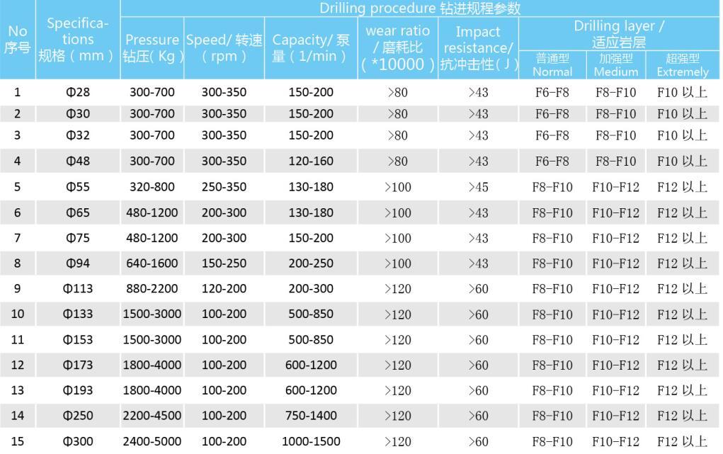 一般地质钻探取芯、水井钻进,针对一般混凝泥土、灰岩、花岗岩等比较坚硬的岩石地层具有良好效果。由于制作工艺的原因,进尺效率明显,破岩能力突出,是煤矿,公路,铁路,桥梁,地质勘探,水里水电等施工单位的理想选择。