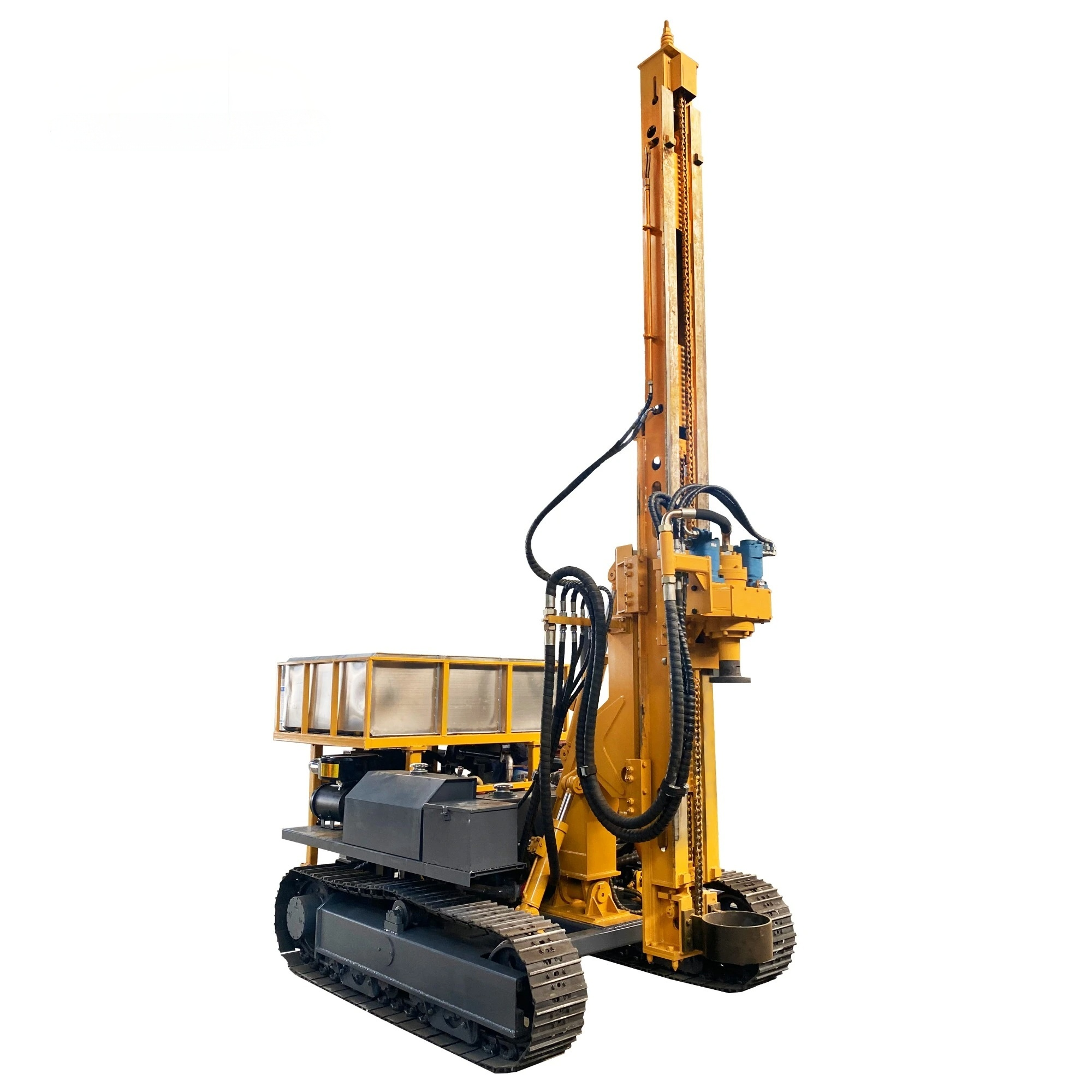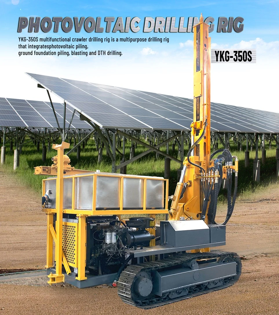 YKG-350S multi-functional crawler drilling rig is a multi-purpose drilling rig that integrates photovoltaic piling, ground foundation piling, blasting and DTH drilling. It adopts new single-bar high-strength crawler chain plates and excavator traveling motors, which have the advantages of strong climbing ability, not easy to be damaged, and long service life. The drilling rig is equipped with a 75KW turbocharged diesel engine from Yuchai Co., Ltd. and adopts new hydraulic technology with low gas consumption. The rotary gearbox adopts dual motors and high torque gearbox, which is easy to move and compact in structure. At the same time, the propulsion carriage has a telescopic compensation function. The carriage supports the ground when drilling, and the drilling performance is stable. The diameter of photovoltaic piling can reach 150mm-400mm, and the diameter of DTH hammer construction can reach 100mm-350mm. The rotation adopts a large torque output motor. YKG-350S drilling rig has the characteristics of flexibility, strong climbing ability, suitable for rough site operations, convenient perforation and shifting, high perforation efficiency, easy maintenance, and high reliability. It is suitable for photovoltaic piling, mining, highways, and water conservancy. It is an ideal multi-purpose drilling rig for construction facilities such as power stations and power stations.