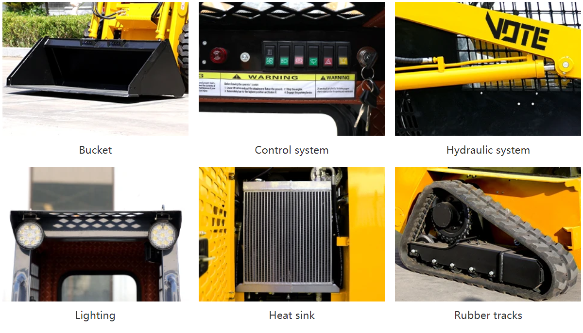 The Vote skid steer loader adopts a skid drive mode, which has excellent flexibility and operability. It can flexibly turn and tilt in a narrow or complex construction site space to improve work efficiency. It can be equipped with a variety of working devices and accessories to meet different work requirements.