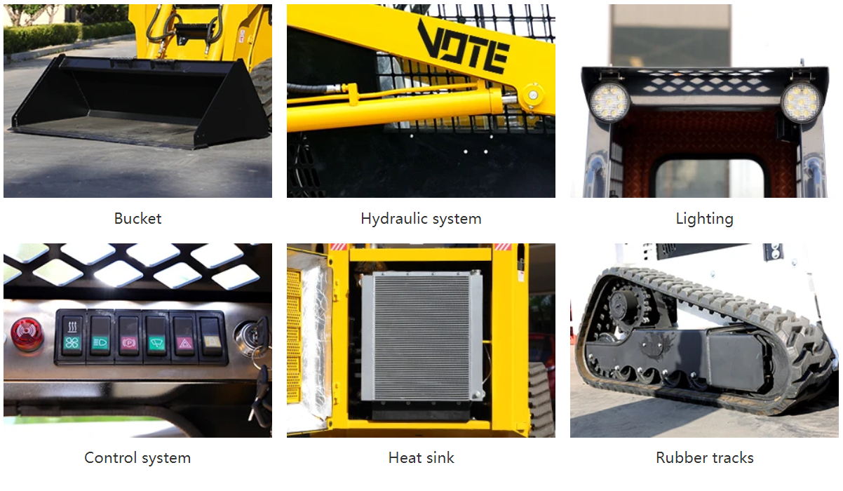 The Vote skid steer loader adopts a skid drive mode, which has excellent flexibility and operability. It can flexibly turn and tilt in a narrow or complex construction site space to improve work efficiency. It can be equipped with a variety of working devices and accessories to meet different work requirements.